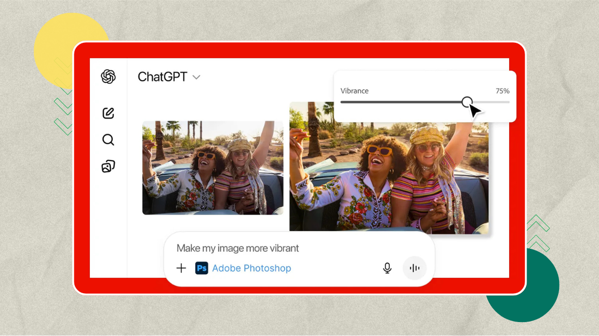 أعلنت أدوبي عن تكامل جديد يسمح لمستخدمي ChatGPT باستخدام مهام فوتوشوب مثل تعديل جزء محدد من الصورة أو إزالة الخلفية أو تعديل الإضاءة والتباين مباشرة عبر المحادثة. كذلك يمكن الاستعانة بـExpress لإنشاء تصاميم من مكتبة الشركة أو إضافة عناصر متحركة إلى الإعلانات والمنشورات، في حين يمنح Acrobat المستخدمين أدوات لتحرير ملفات PDF ودمجها أو استخراج الجداول منها دون مغادرة واجهة الدردشة.