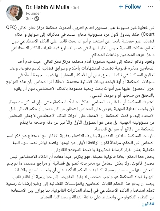 واقعة قطر: محامٍ في محكمة مركز قطر المالي يستند إلى أحكام قضائية وهمية "اخترعها" الذكاء الاصطناعي، مما أثار صدمة في الوسط القانوني.