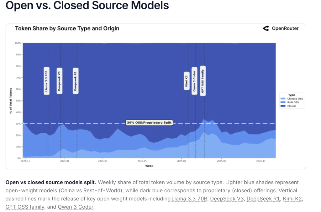 تُظهر البيانات أيضًا تحولًا جغرافيًا بارزًا: النماذج الصينية تمثل الآن نحو 30% من الاستخدام العالمي بعد أن كانت 13% فقط. أسماء مثل DeepSeek وQwen وMoonshot AI أصبحت مألوفة في بيئة المطورين والمستخدمين، ما يؤكد أن مراكز الابتكار لم تعد حكرًا على الغرب. كما ارتفعت نسبة استخدام اللغة الصينية المبسطة إلى 5% من التفاعلات، وهي ثاني أكثر اللغات تداولًا بعد الإنجليزية.