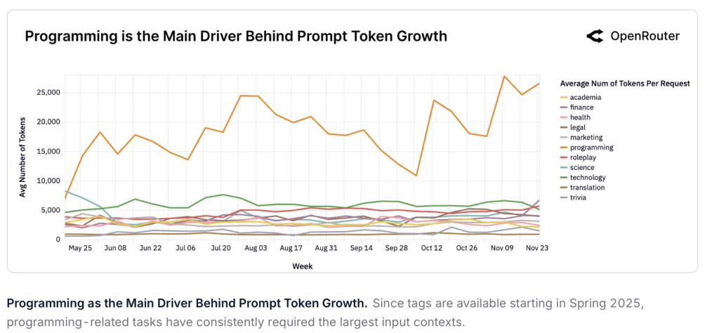 بالرغم من سيطرة الاستخدام الإبداعي، تبيّن أن المجال الأسرع نموًا هو البرمجة. فقد قفزت الطلبات البرمجية من 11% في مطلع عام 2025 لتصل إلى أكثر من 50% بنهايته.