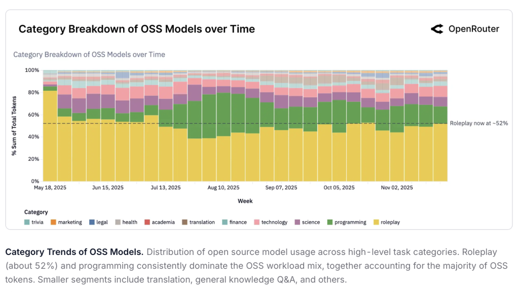 حللت الدراسة أكثر من مئة تريليون “رمز لغوي” تمثل مليارات التفاعلات مع نماذج مثل ChatGPT وClaude وغيرها، دون الوصول إلى نصوص المحادثات نفسها حفاظًا على الخصوصية. كانت النتيجة مفاجئة: أكثر من نصف استخدامات النماذج مفتوحة المصدر موجّهة للحوارات التخيّلية والتمثيل السردي، لا للبرمجة أو الأعمال الإنتاجية.