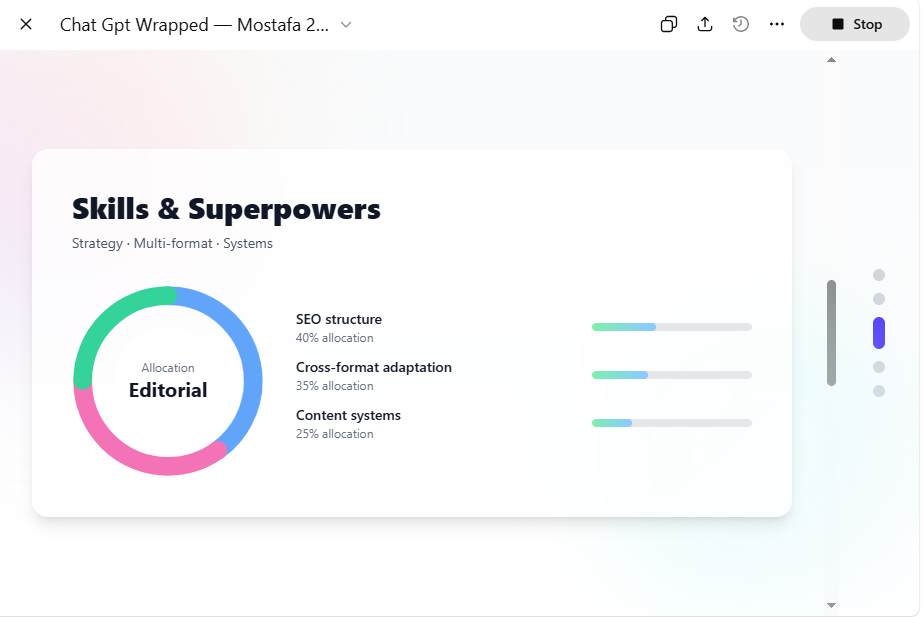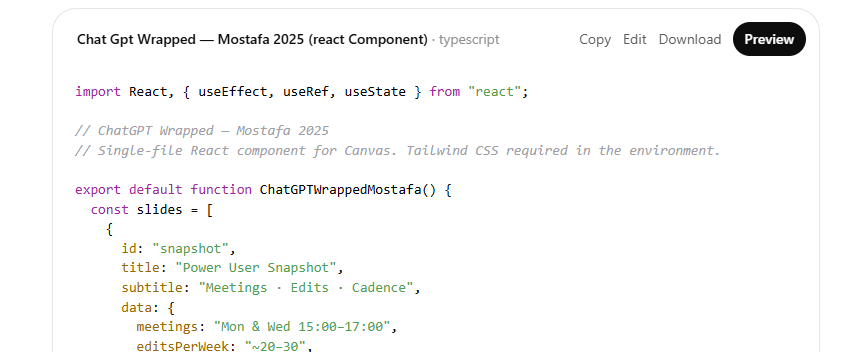بعد الاتفاق على البنية، يقوم الذكاء الاصطناعي بتوليد مكوّن React كامل يعمل كعرض شرائحي بتصميم مستوحى من Wrapped، ويجمع بين الرسوم البسيطة والتدرجات اللونية والمؤشرات البصرية. ويجري عرض النتيجة داخل Canvas عبر وضع المعاينة، ما يجعل التجربة أقرب إلى استعراض لموقع صغير صُمم خصيصًا كملف شخصي سنوي.