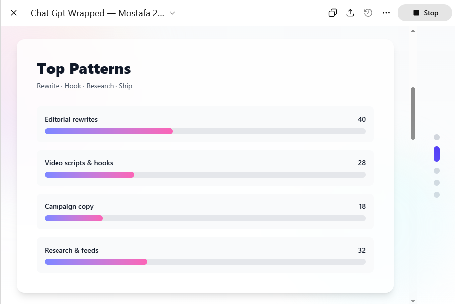 على خلاف التقارير التقليدية، يأخذ هذا الأسلوب شكل قصة قصيرة يندمج فيها العنصر الإحصائي مع اللمسات الفنية. النتيجة ليست قياسات دقيقة بقدر ما هي قراءة تقريبية لطريقة التفاعل مع نموذج الذكاء الاصطناعي على مدار أشهر، مصاغة بأسلوب شبيه بعروض تطبيقات المحتوى الترفيهي.