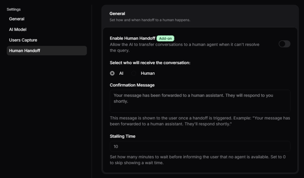 جرب مركز مساعدة ذكي يُدمج معرفة شركتك، يدعم اللغة العربية، ويُمكن أي استفسار أن يُصعّد للبشر — هكذا تضمن أن البوت لديك ليس مجرد ردّ، بل حلّ.