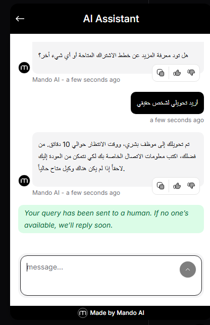 - نظام تصعيد بشري يتدخل تلقائيًا عندما يتعثر الرد، مع إرسال إشعار للفريق وتشمل الحالة ملخّص محادثة وتحليل المشاعر.
