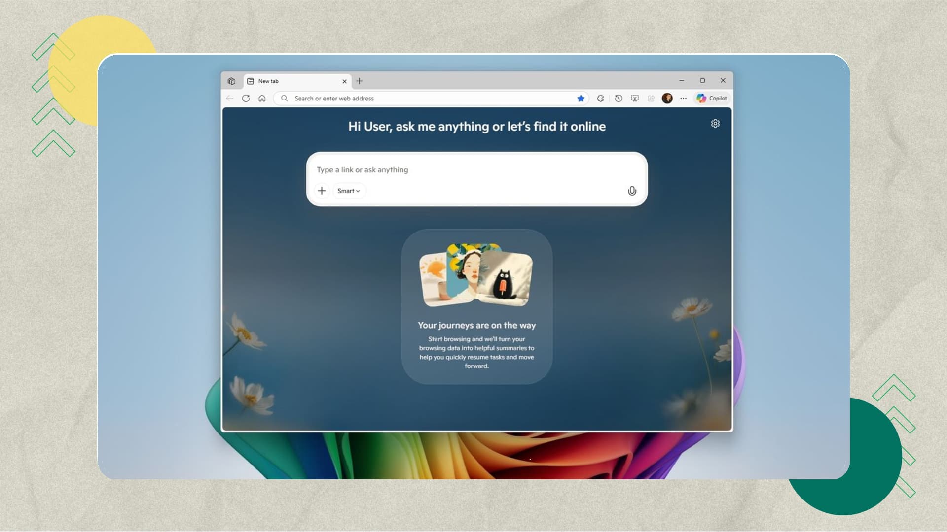 عند فتح تبويب جديد، ستجد في أسفل مربع Copilot قوائم Journeys الجاهزة. يمكنك الضغط على أي رحلة لاستعراض الصفحات أو متابعة القراءة من حيث توقفت.