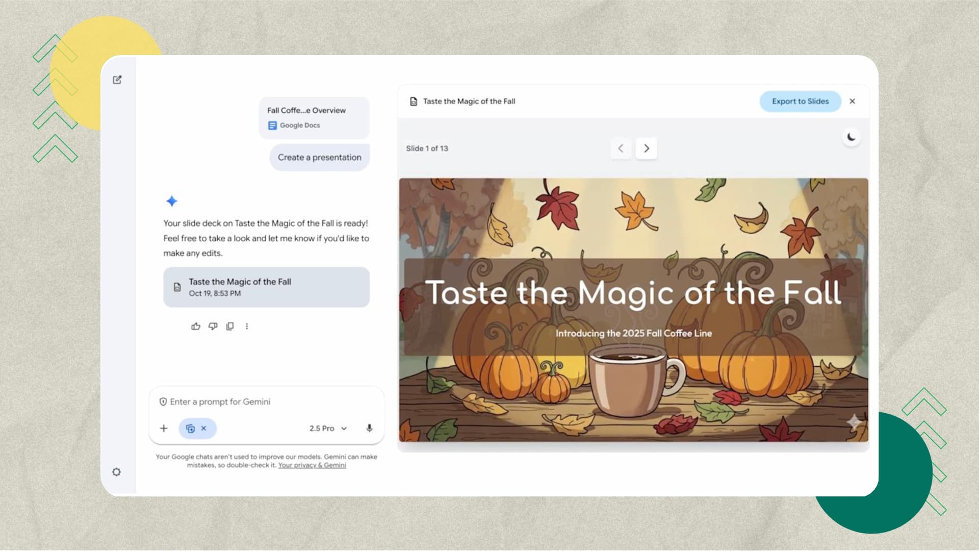 ما يثير الاهتمام في هذه الميزة هو قدرتها على دمج الذكاء الاصطناعي بسلاسة مع أدوات غوغل الأخرى. إذ يمكن تصدير العروض مباشرة إلى Google Slides والتعديل عليها مع الفريق. يتحول الذكاء الاصطناعي هنا من منتج جاهز إلى نقطة بداية ديناميكية تتيح للفرق تطوير أفكارها بسرعة دون أن تقتل روح التعاون الإنساني.