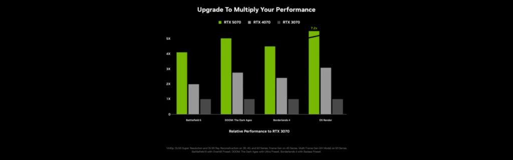 - تتبع الأشعة (Ray Tracing): بفضل الجيل الثالث من أنوية تتبع الأشعة، تحقق ألعاب مثل Black Myth: Wukong وDoom: The Dark Ages زيادة في الأداء تتخطى 70%.