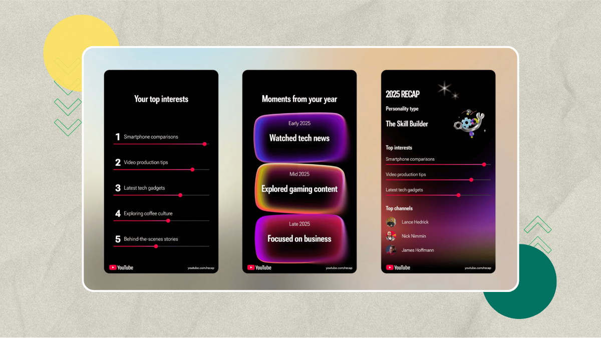 يتيح "YouTube Recap" بطاقات مخصصة تُظهر القنوات المفضلة وأنماط سلوك المشاهدة.